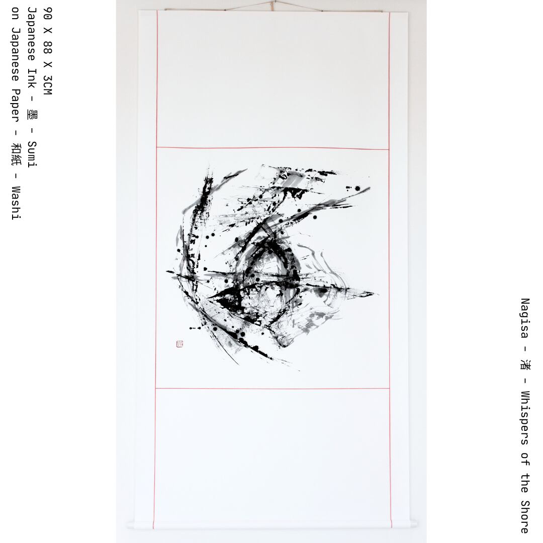 ひときわ心を打つ美しさ、Nagisa 渚, Whispers of the Shore, 2024。自然の繊細さと感動を映し出すこの作品は、海岸の静けさと波のささやきを海という漢字をモチーフに墨と筆で表現しました。優雅なラインと穏やかな色合いが醸し出す雰囲気は、日常の喧騒から解放されるひとときをもたらします。あなたのお部屋に飾ることで、心に安らぎの空間を創り出し、日々の生活に深い癒しを与えることでしょう。