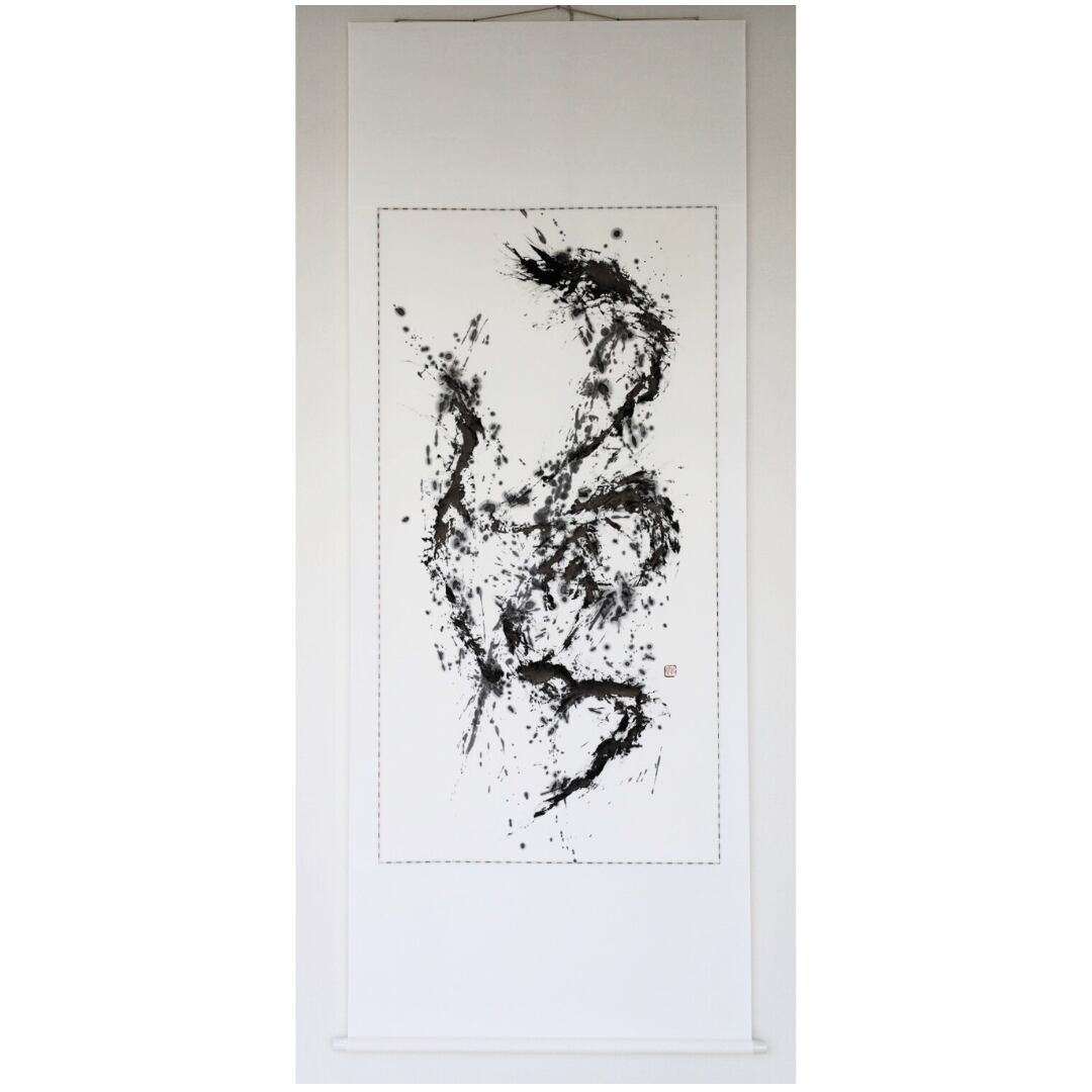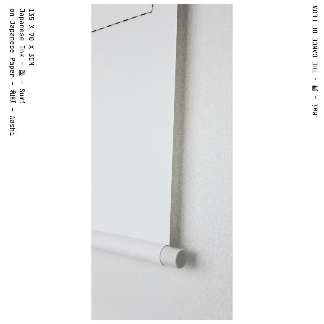 マドリードのヴァンゴッホアートギャラリーのために制作された唯一無二の作品です。こちらの作品は、舞という漢字をモチーフにした美しい書道アート「Mai-舞-, The Dance Flow」です。、軽やかに舞い踊るような明るい華やかさを演出しています。墨と和紙が織り成す鮮やかな色彩と流れるような線は、まるで優雅な踊りを思い起こさせ、見入ってしまうことでしょう。